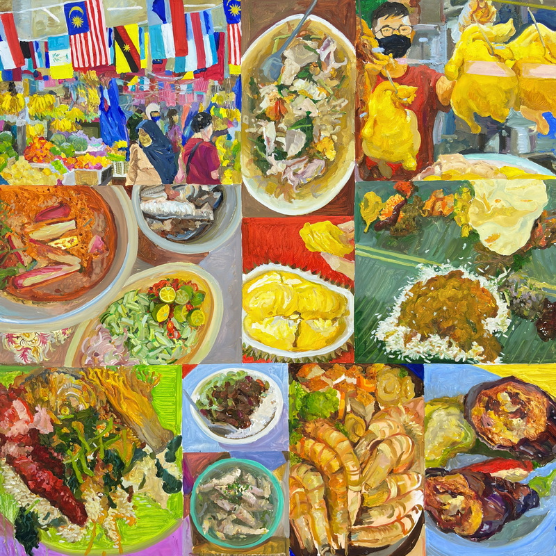 Migration transformed the artist’s relationship with food. Moving from Sabah to West Malaysia in 2011 opened their world to a kaleidoscope of flavors, dishes from every corner of the country, each cooked, layered and complex. Here, the raw and the cooked stand in dialogue: the richness of the present set against the unprocessed memory of the past. That memory begins with a pasar tamu scene from Sabah, a vibrant marketplace where food exists in its rawest form. For the artist, it is a repository of memory, a sensory anchor to home, held with deep nostalgia. The raw produce speaks of memory in its pure form; the cooked dishes embody experiences shaped through migration. Together, they show how the past remains vivid even as the present deepens.